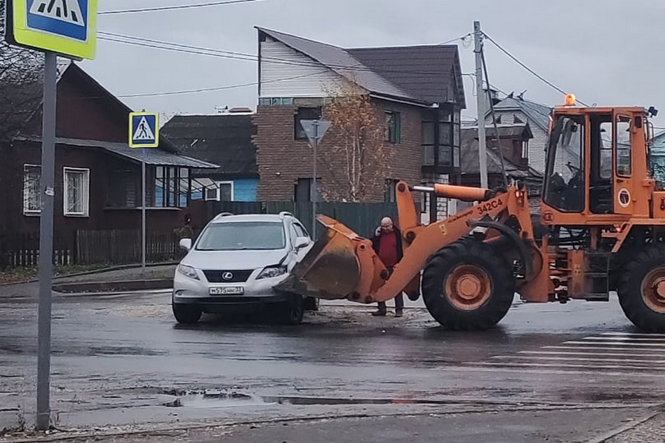 Автомобиль марки Lexus двигался по улице Тургенева, и на пересечении с улицей Чкалова крыло седана зацепил ковш дорожной машины.