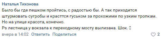 В социальных сетях жители жалуются на то, что либо плохо расчищено, либо вовсе не расчищено. Тротуары остаются завалены снегом и пешеходам приходится пробираться по узкой тропинке.