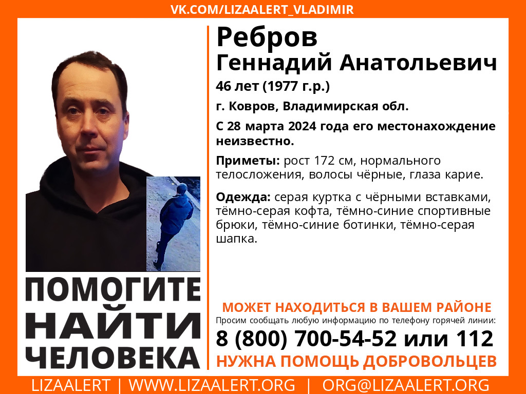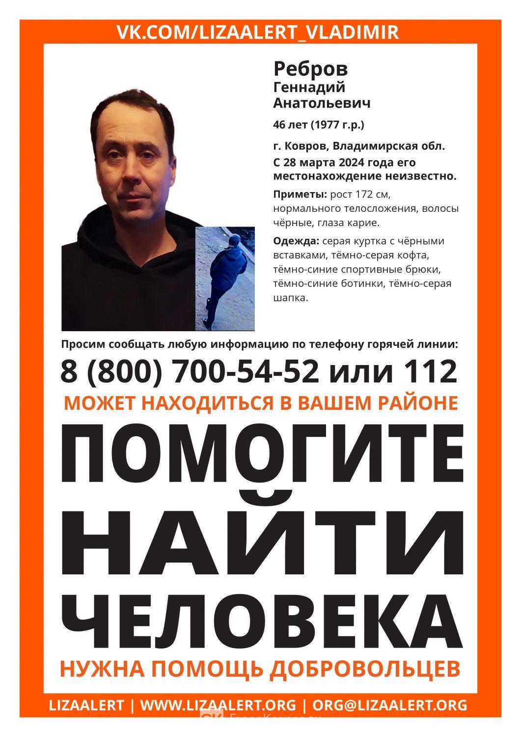 Представители ЛизаАлерт сообщили о поисках 46-летнего ковровчанина, местонахождение которого неизвестно с 28 марта 2024 года.