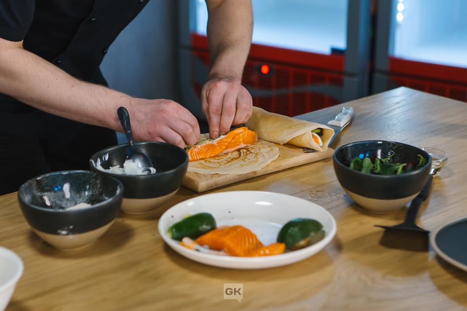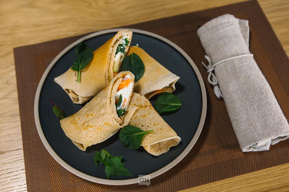 Приступаем к подготовке ингредиентов. Авокадо нарезаем соломкой, берём лосось его мы тоже режем соломкой. В готовые блинчики (на середину) выкладываем сыр, добавляем микс салата, авокадо и лосось. Заворачиваем и режем по диагонали!