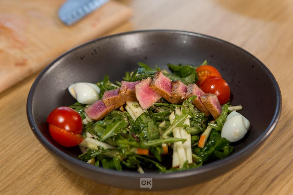 Для приготовления салата с тунцом нам понадобится салатный микс, перепелиные яйца, помидоры черри, соус Pesto, оливковое масло, четвертинка яблока, соевый соус, кунжут и — тунец.