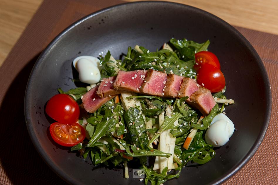Разогреем сковородку, на небольшом количестве масла обжариваем тунца со всех сторон и добавляем соевый соус (нарезать его лучше вдоль волокон, чтобы он сохранил форму). Добавляем тунец, сверху посыпаем кунжутом. Салат готов!