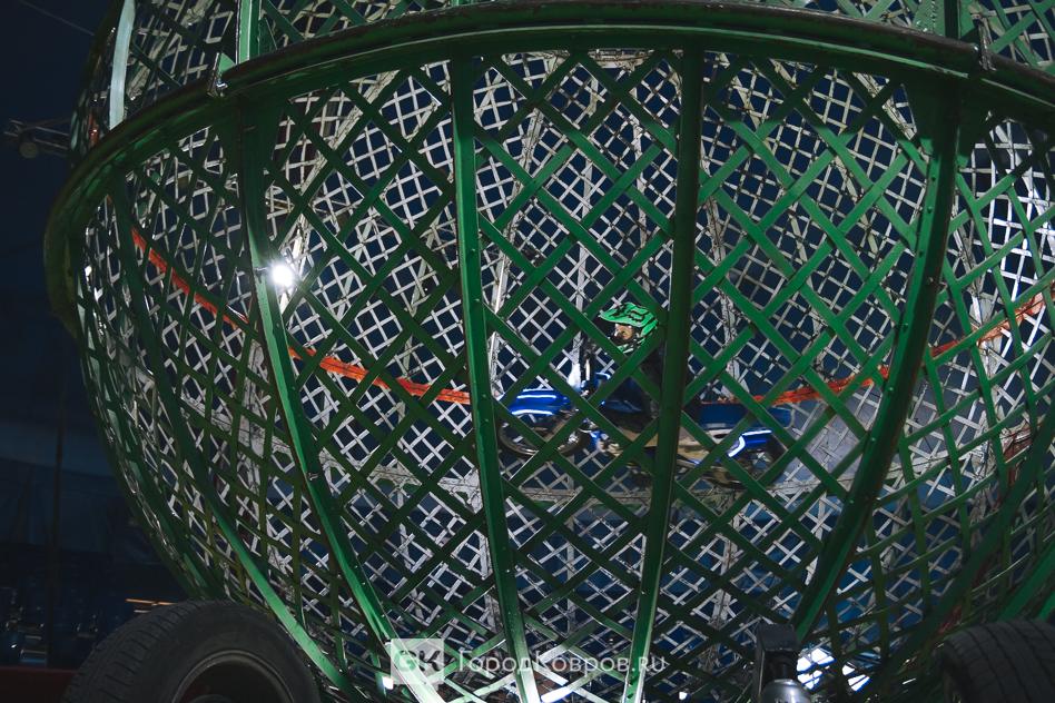 То, во что втянули меня – фрагмент. А сам номер в том, что внутри шара катается вначале один, потом, два, а потом три мотоциклиста. И четвёртый человек стоит на том самом пятачке, где была я. Насколько понимаю, на представлении в шар приглашают любителей адреналина из числа зрителей. Очень экстремально!
