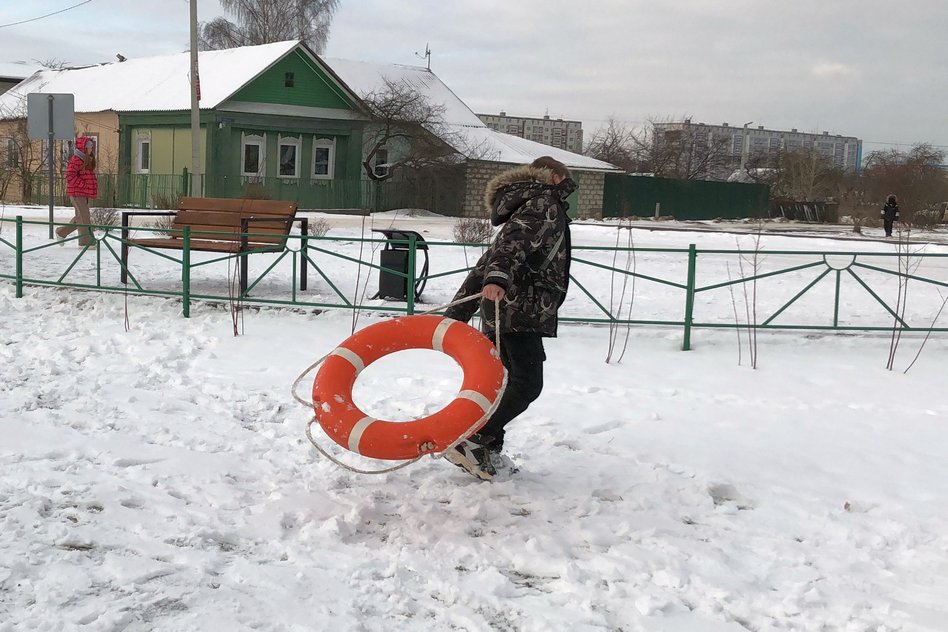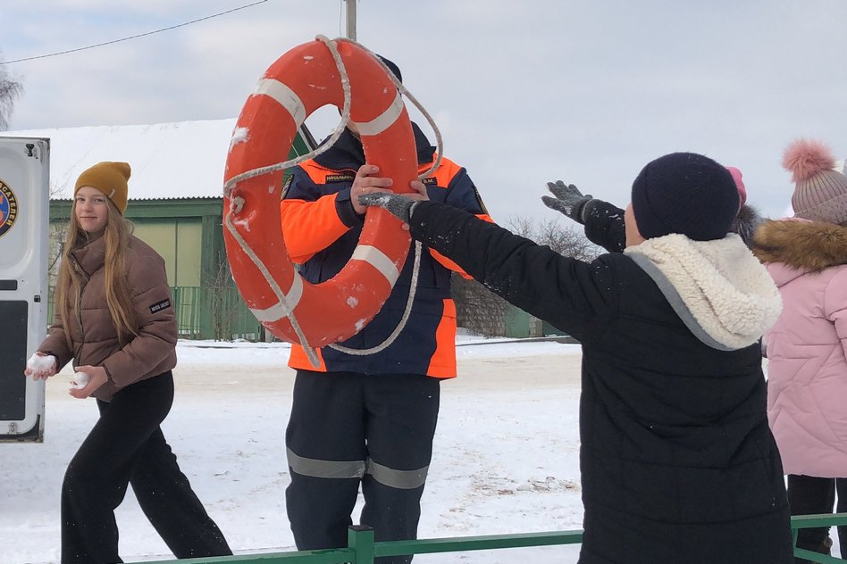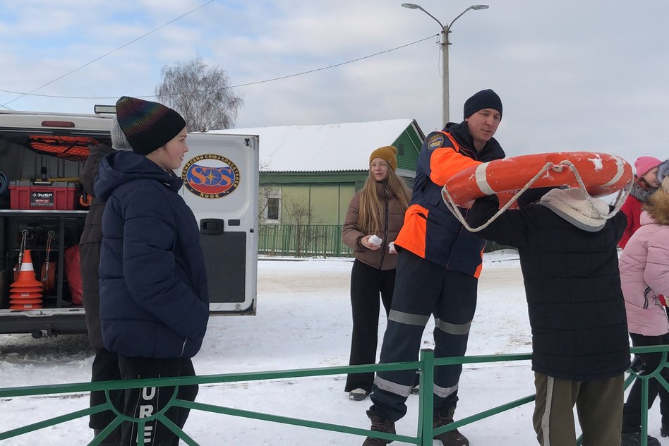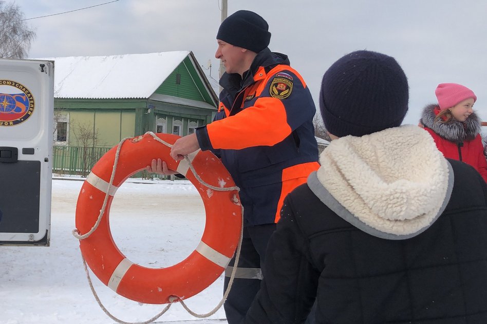 Спасатель РОССОЮЗСПАС Владимир Федоров рассказал ребятам, как вытаскивать провалившегося под лед человека, как использовать для этого спасательный круг и конец Александрова и чем их можно заменить.
