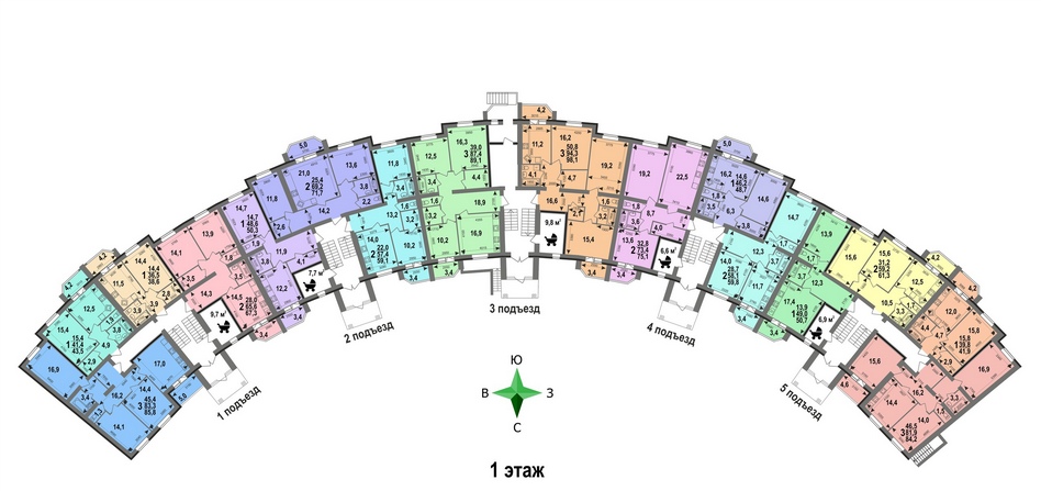 … дом радиальной формы, расположенный на площади Победителей. Дом состоит всего из 5 этажей, 88 квартир и 5 подъездов. … дом выполнен в едином архитектурном стиле с обликом «Славного» …но имеет ряд отличительных особенностей…