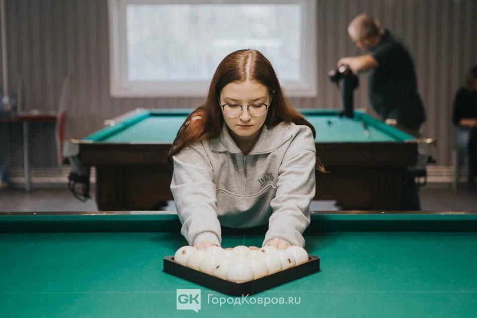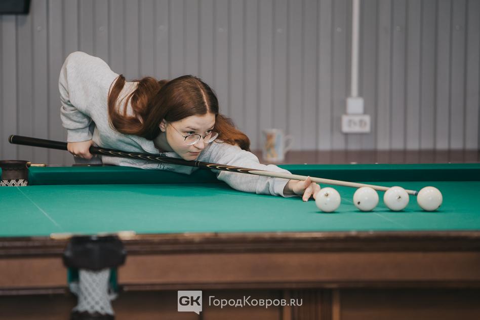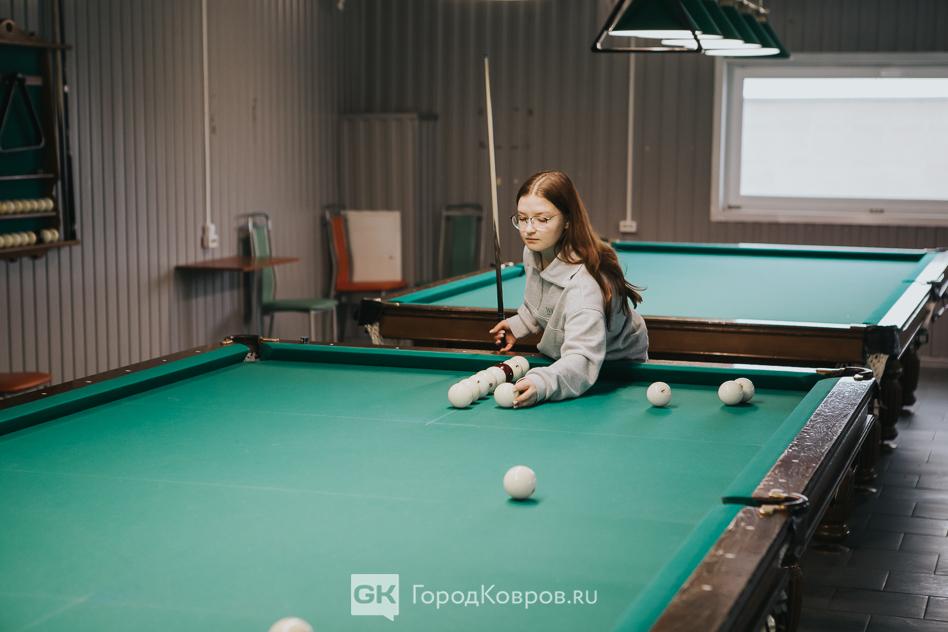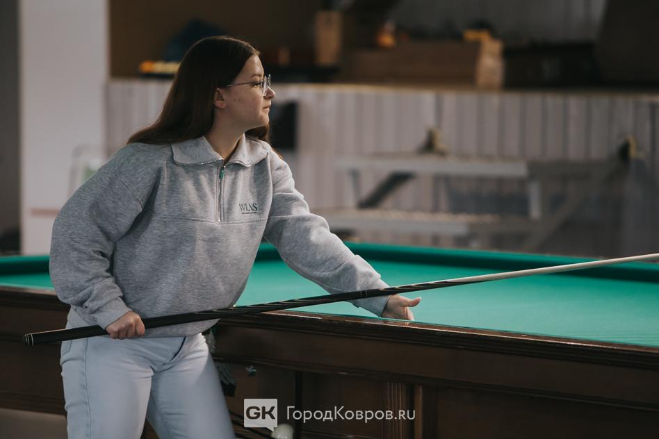 Карина – бывшая ученица Максима Виноградова. Сейчас, по окончании школы в Коврове учится в Нижнем. Но увлечение бильярдом не оставила, в каникулы приехала домой и зашла, пользуясь случаем, потренироваться.