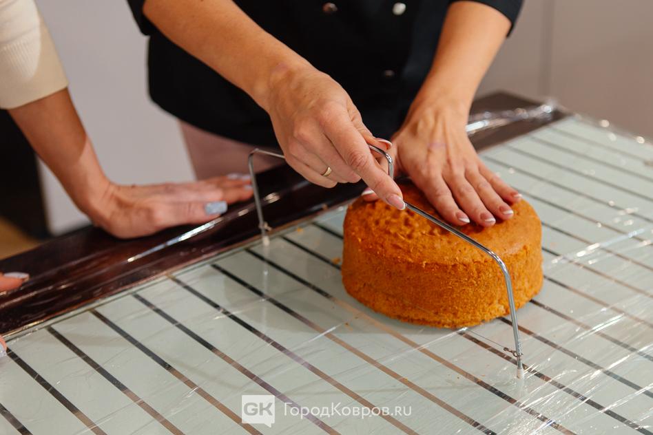 Для этого у профессиональных кондитеров имеются специальные ножовки. Сделать из одного высокого коржа два или даже три бисквитных «блинчика» помогает тонкая натянутая струна. За толщину коржей отвечает леска — она зафиксирована так, чтобы просто «провезти» ножовку через бисквит.