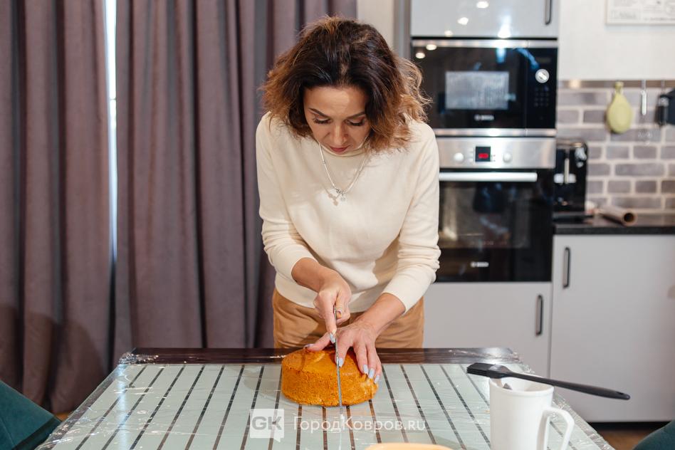 Вначале с опаской, потом — смелее, но с пышными коржами, которые Аня накануне приготовила, мне удалось справиться. По словам моего кулинарного наставника, получилось неплохо. Срезать, кстати, пришлось ещё и верхушку бисквита. Аппетитную верхнюю корочку Аня безжалостно смяла и выбросила. Когда хочешь сделать не только вкусно, но и красиво, приходится многим жертвовать…