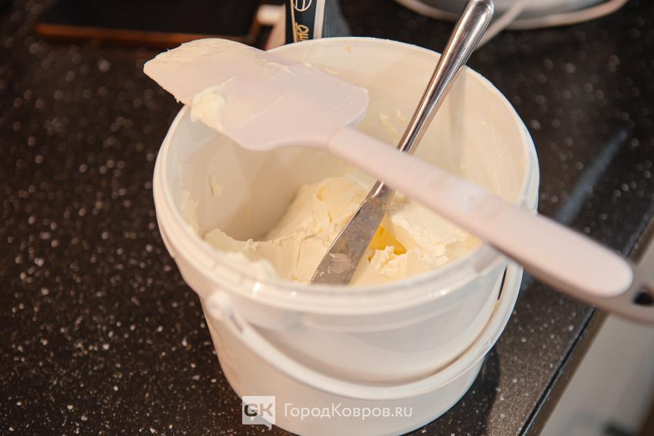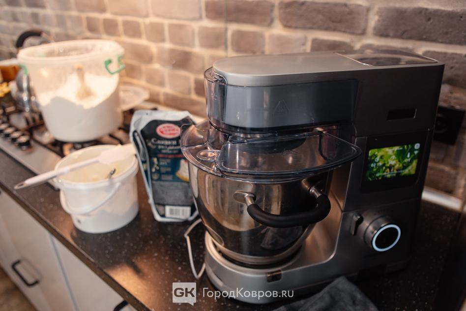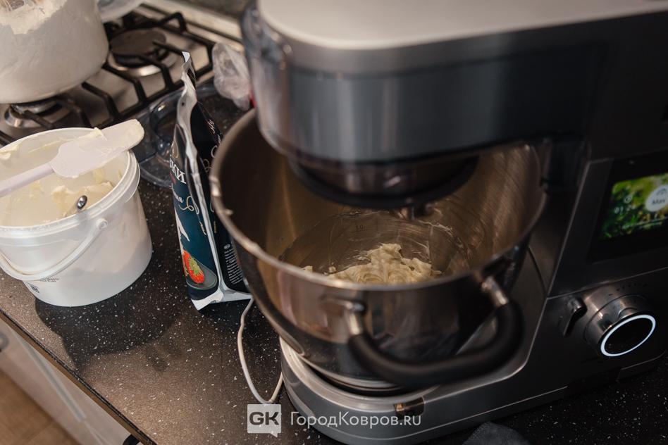 Пришло время промазать коржи кремом. Пока я нарезала бисквитные слои Аня уже успела взбить крем. Тут ей помог чудо-миксер. Это профессиональная кухонная техника, по сути — компьютер со встроенными весами, возможностью подогрева в чаше и регулировкой интенсивности взбивания. В обычных домашних условиях такой крем тоже можно сделать. Но времени и сил потратишь больше на порядок.