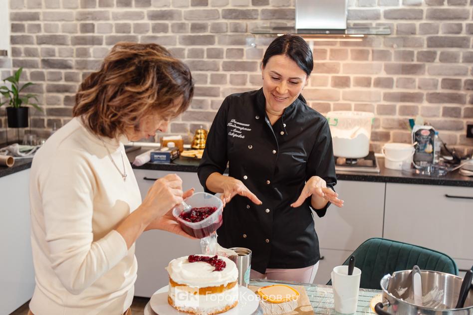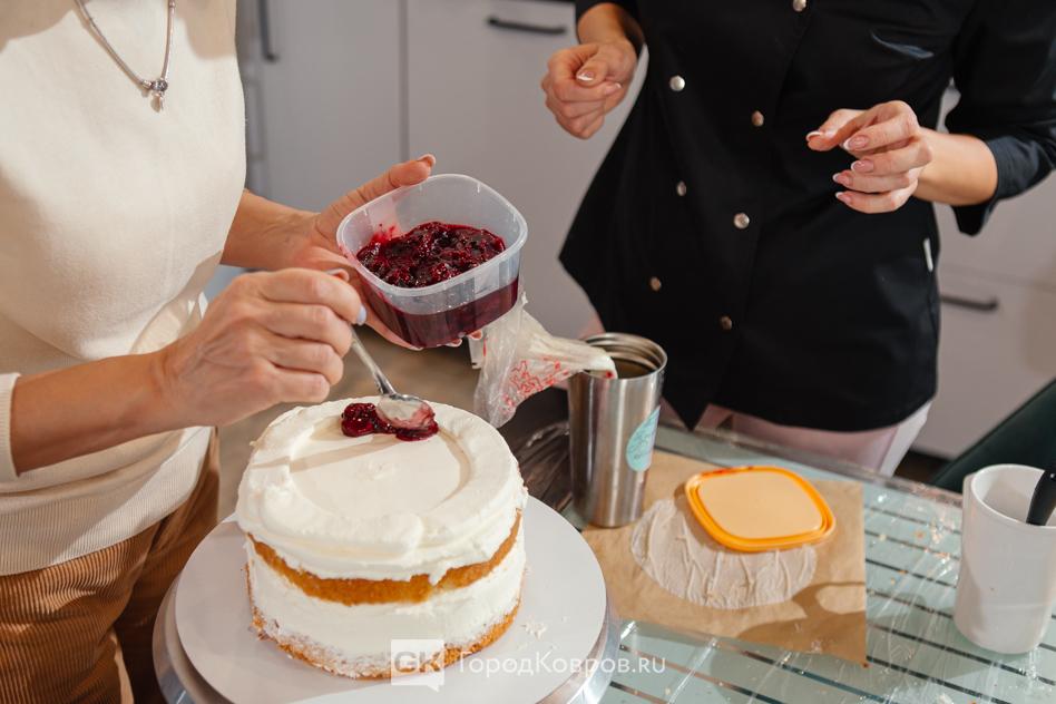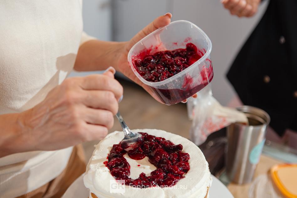 И у нас «на повестке дня» был именно такой классический ванильный бисквит, прослойка — чизкейк, украшение — вишня. Всё это у Ани было к моему приходу уже готово. Поэтому моя работа началась с разрезания коржей.