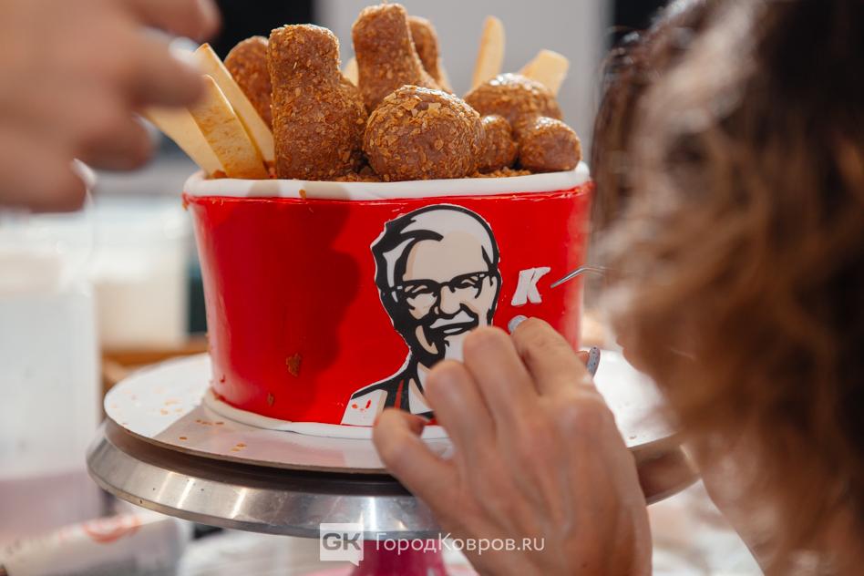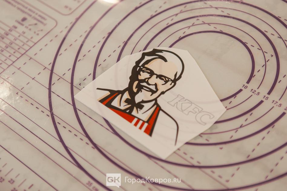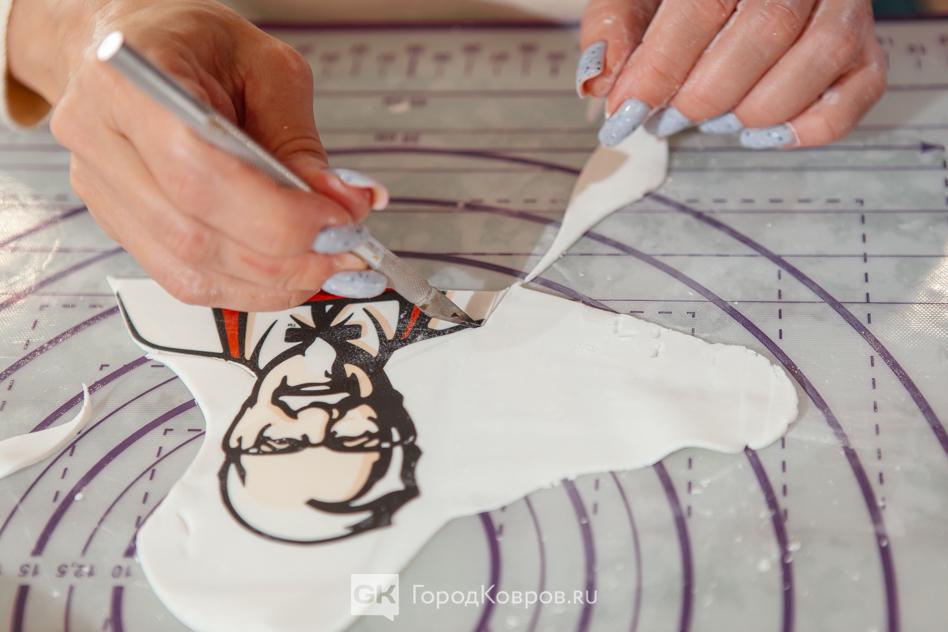 Что за конструкцию мы с Аней решили сделать, было понятно из первых фото — KFC. Понятное дело, полковника Сандерса вручную никто не рисует. Рисунок заказывают и печатают на специальном принтере. Изображение — это тонкий сахарный листочек, который нужно наложить на раскатанную мастику.