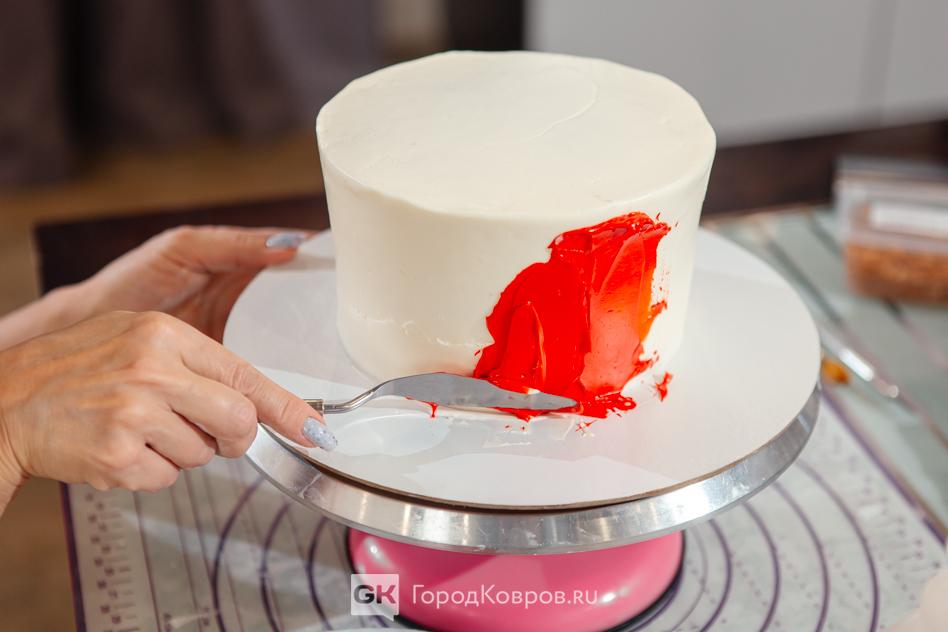 Ведь наш белоснежный цилиндр ещё надо сделать алым. Пищевые красители сейчас можно купить какие угодно. Итоговый цвет вымешиваем, и процесс очень похож с тем, что делает на палитре художник.