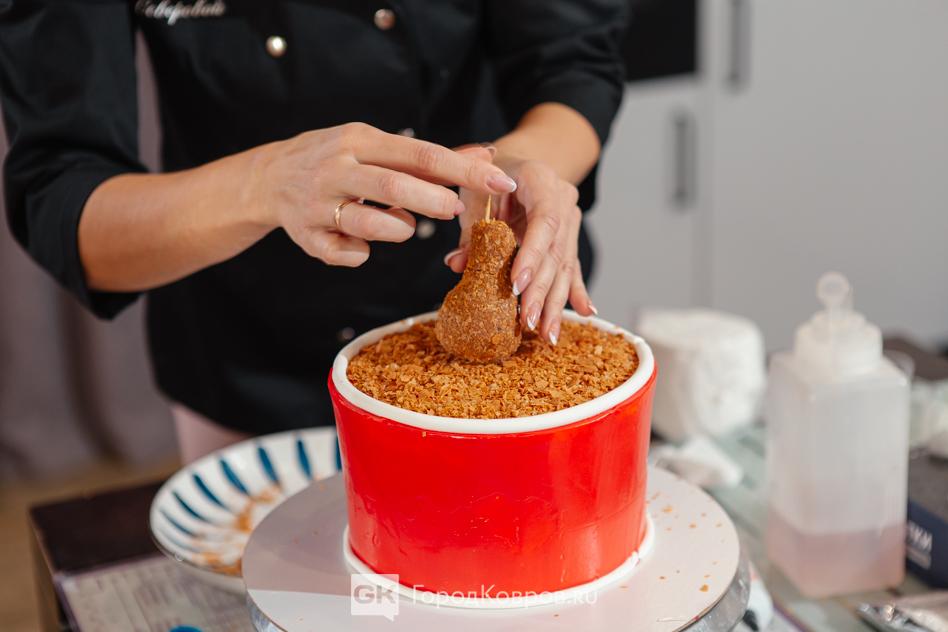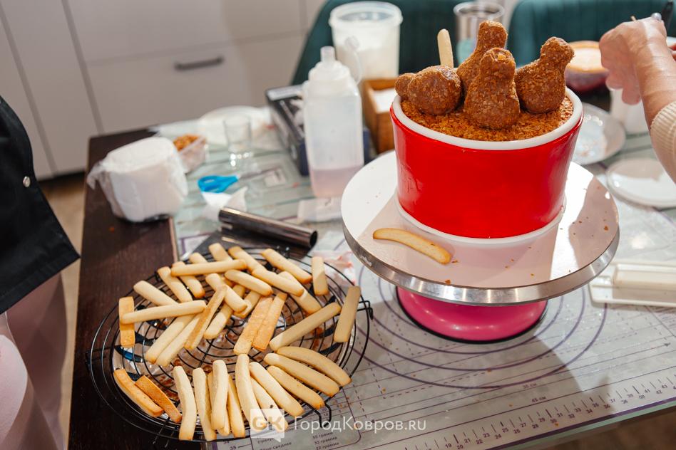 Расскажу, из чего было финишное оформление. Куриные бёдра — это пирожное «Картошка», панировка — это панировка, «картошка фри» — подсушенная выпечка, надписи — сахарные листочки. А сцепка — деревянные шпажки.