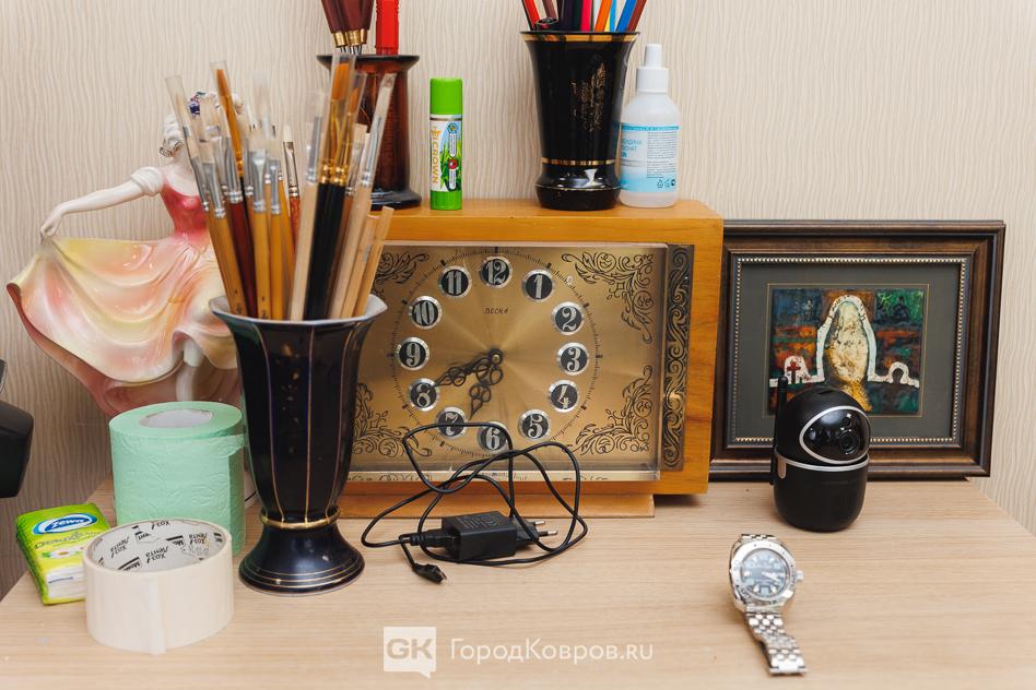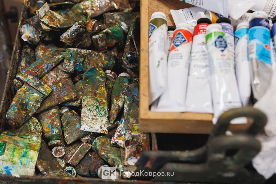 Только тут заметила, что на фоне общей чистоты и порядка прилегающий к мольберту пятачок у Юрия несколько «взубдораженный» — всё же творческий бардак имеет место быть.