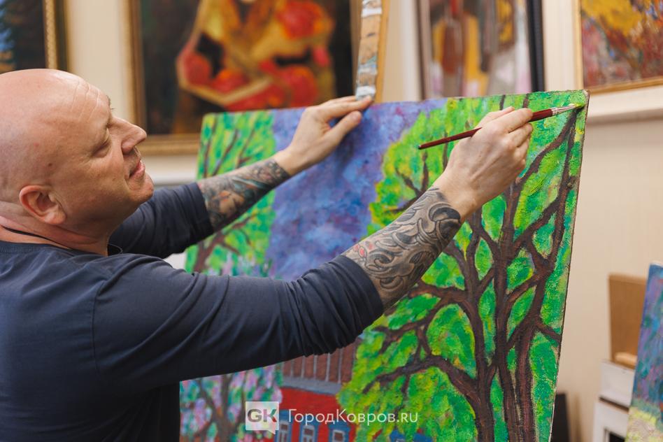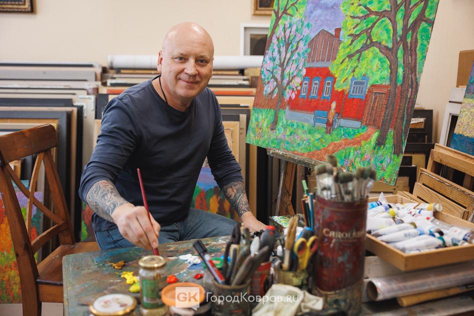 - «Художником стал в 40 лет, то есть не в юности. Вначале я коллекционировал и перепродавал картины. В том числе занимался продажей картин ковровских художников. Однажды из Москвы поступил крупный заказ для моего художника. Я купил краски и холсты и отвез предоплату. А художник начал пить. Пил месяц-два. А заказчик спрашивал, где картины. Я пошел к своему художнику, а тот руками развел. Деньги пропил, картины не написал… Я забрал у него холсты, на которых он так ничего и не написал, и поехал в Москву возвращать деньги. Поехал по дороге через Кольчугино. Дело было в мае. Там гористая местность. И вдруг я увидел красоту: зелень, чёрные вкрапления, а вдалеке белый храм на горе. Я остановился, вышел из машины, смотрела на этот вид. И сказал себе: обязательно попробую нарисовать. Вернулся домой и сделал это».