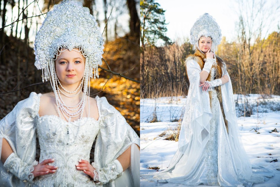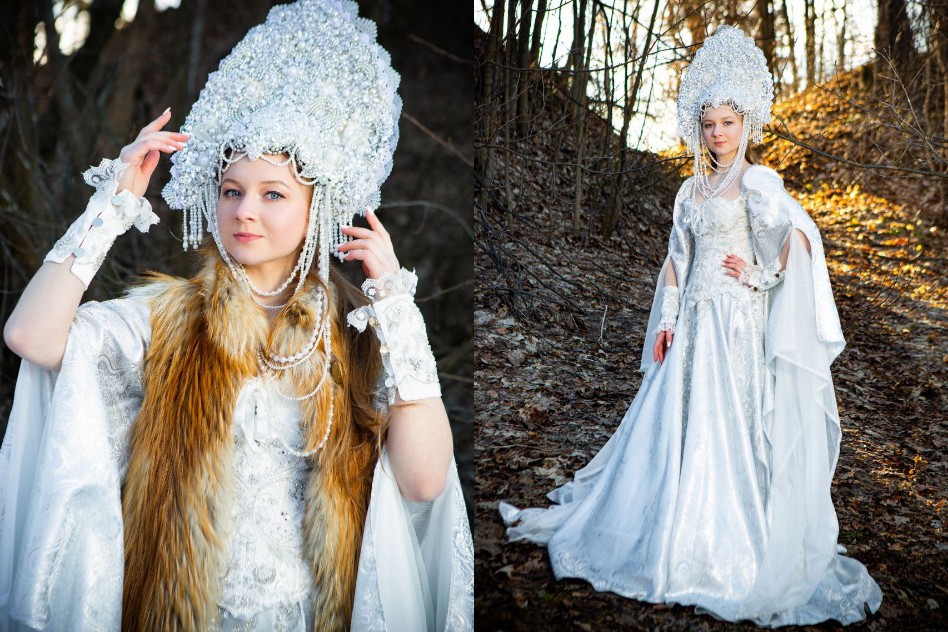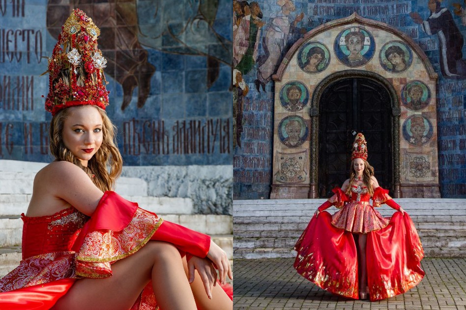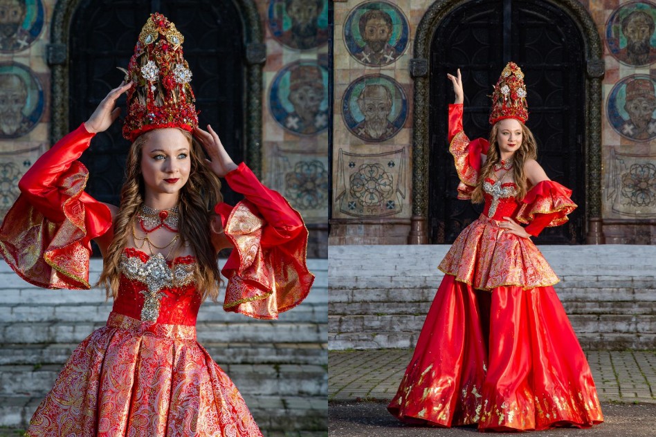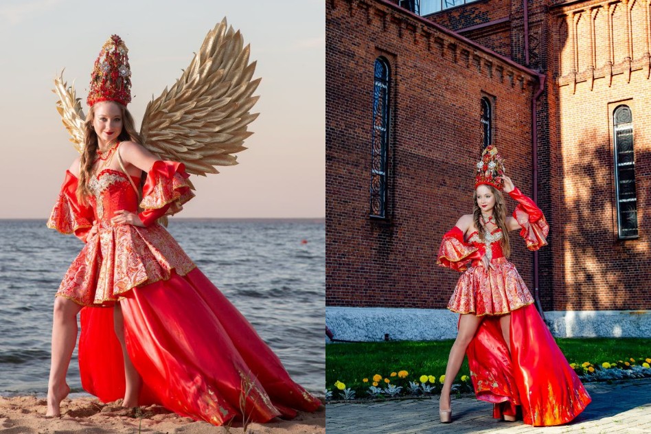 «Это получилось спонтанно. Для конкурса нужен был уникальный образ, и я решила не брать платье в аренду, а создать костюм самостоятельно. Помню, как папа помогал мне искать ткани на огромном рынке в Кыргызстане, а мама консультировала по дизайну. Вначале родился образ из белой парчи — «Царевна Лебедь». Потом была «Жар-птица»…