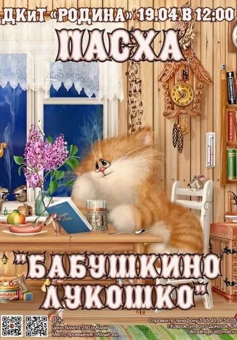 Фольклорная программа «Бабушкино лукошко. Пасха. Сказочный клуб «Бабушкино лукошко» приглашает на очередное заседание малышей и родителей. Программа пройдет в рамках пасхальных мероприятий.Атмосфера русской избы позволит каждому окунуться в русскую старину