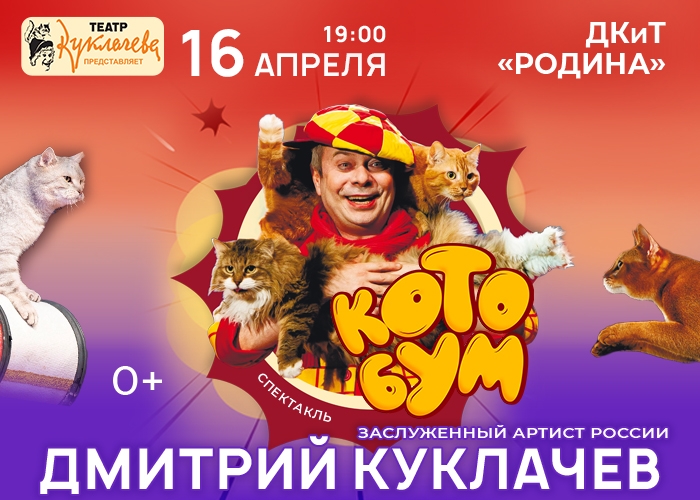 Добро пожаловать в волшебный мир Театра кошек Куклачёва! Главное семейное событие сезона — спектакль «КотоБум»!Представьте: два озорных хулигана, спасаясь от полиции, случайно попадают в загадочный и волшебный мир, где живут… кошки! 40 живых кошек на сцене!