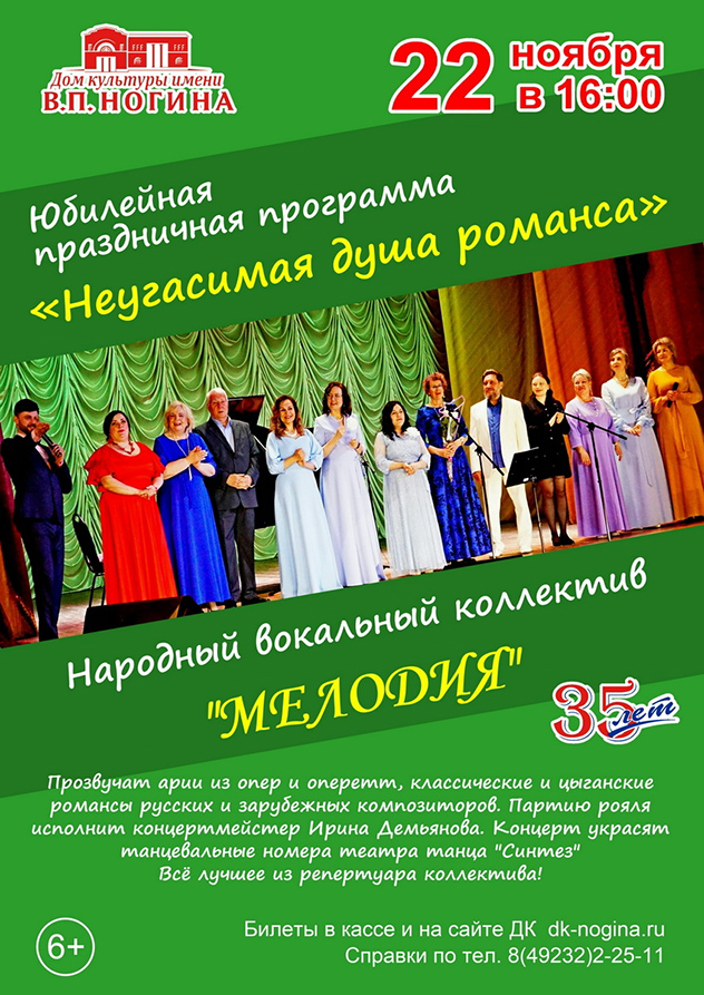 В исполнении народного вокального коллектива «Мелодия» прозвучат арии из опер и оперетт, классические и цыганские романсы, песни русских и зарубежных композиторов. Праздничную программу украсят танцевальные номера театра танца «Синтез».