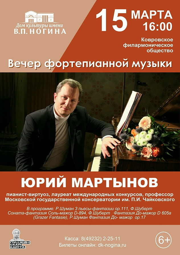 Ковровское филармоническое общество представляет концерт фортепианной музыки в исполнении Юрия Мартынова. Юрий Мартынов – музыкант, искусно владеющий фортепиано и различными клавишными инструментами.