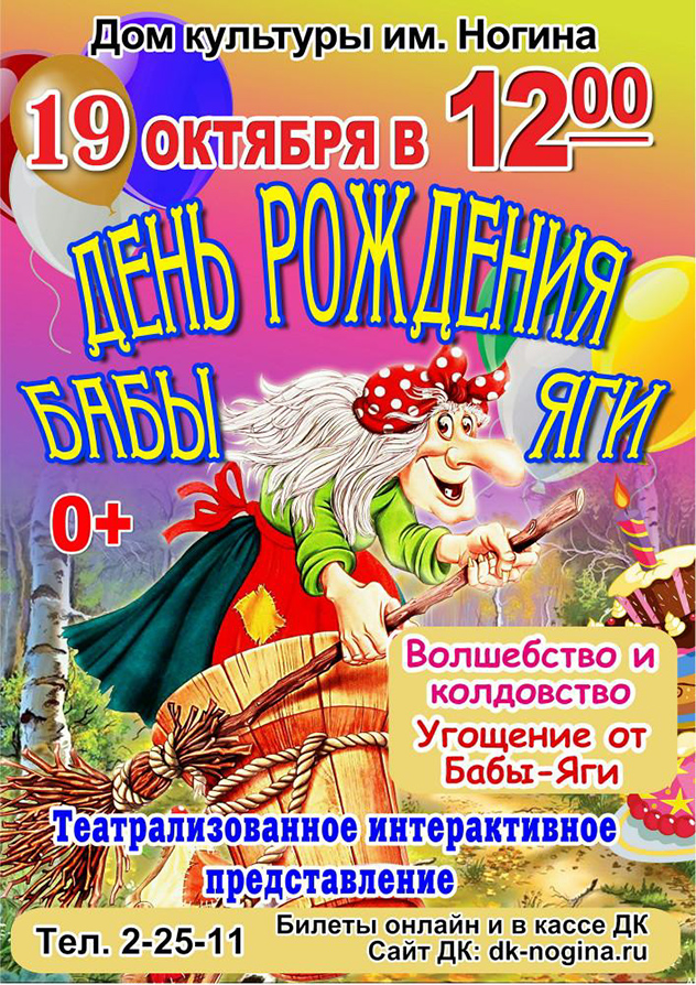 Самый притягательный и обаятельный персонаж русских сказок, Баба – Яга, празднует свой день рождения и приглашает в гости ребят и их родителей! Театрализованная интерактивная игровая программа, подготовлена артистами фольклорного театра «Закрутиха» с участием виновницы торжества.