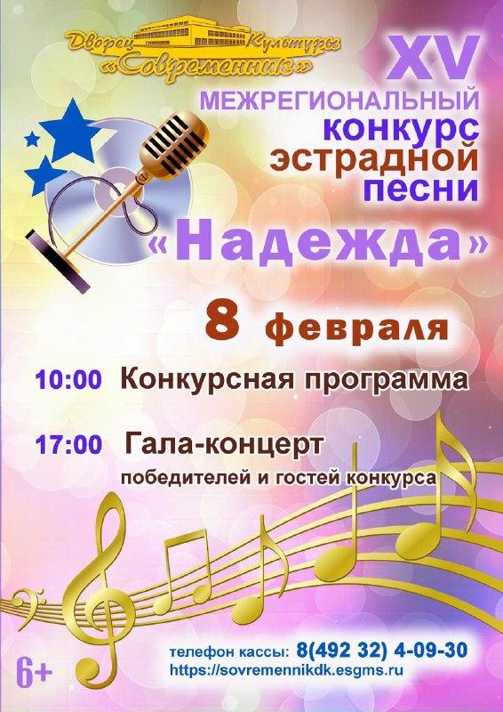 XV межрегиональный конкурс эстрадной песни «Надежда». В 10:00 конкурсная программа. В 17:00 гала-коцнерт.