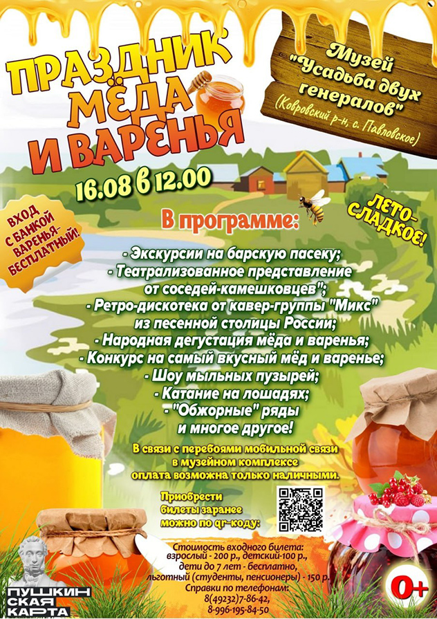 Ежегодный праздник «Мёд и варенье» в музее «Усадьба двух генералов» в селе Павловское. Этот день предназначен специально для тех, кто знает толк в сладостях, любит варенье и ценит натуральный мёд от местных пасечников. Здесь вы забудете обо всех диетах и насладитесь настоящим гастрономическим праздником!