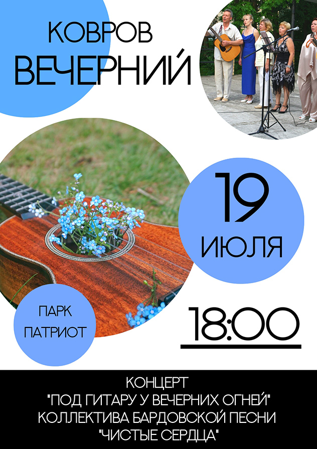 «Ковров Вечерний» приглашает на концерт «Под гитару у вечерних огней» коллектива бардовской песни «Чистые сердца».