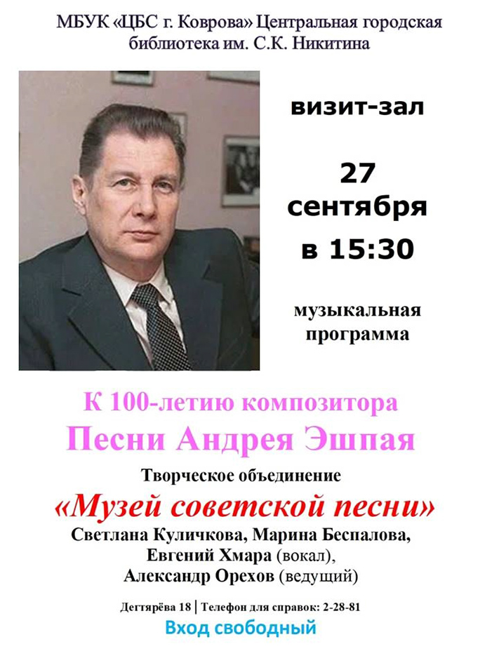 Творческое объединение «Музей советской песни» приглашает на музыкальный вечер, посвященный 100-летию композитора. В программе песни Андрея Эшпая.