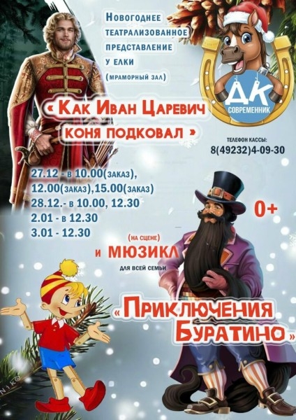 Новогоднее театрализованое представление у елки «Как Иван Царевич коня подковал» и мюзикл для всей семьи «Приключения Буратино».
