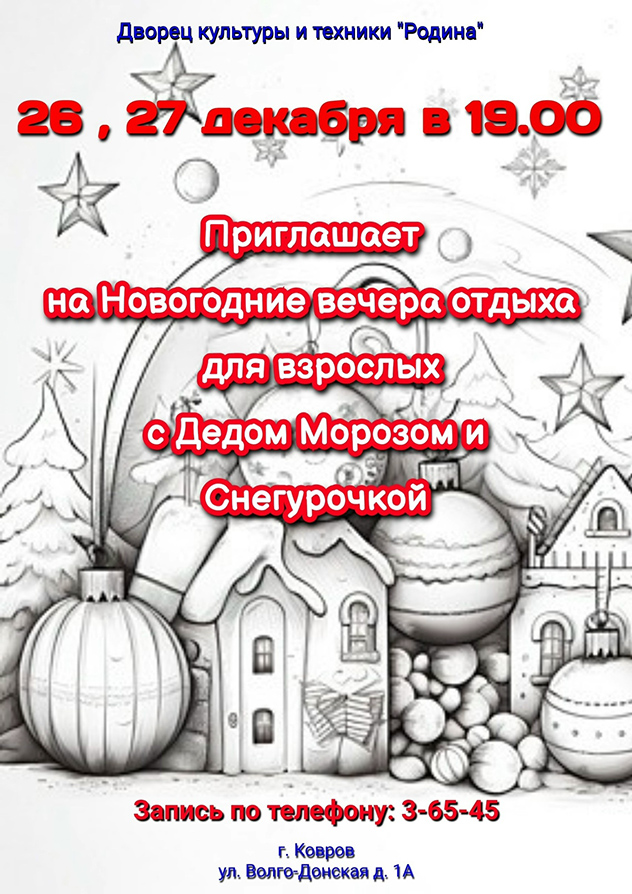 Предновогодние вечера отдыха для взрослых с Дедом Морозом и Снегурочкой.
