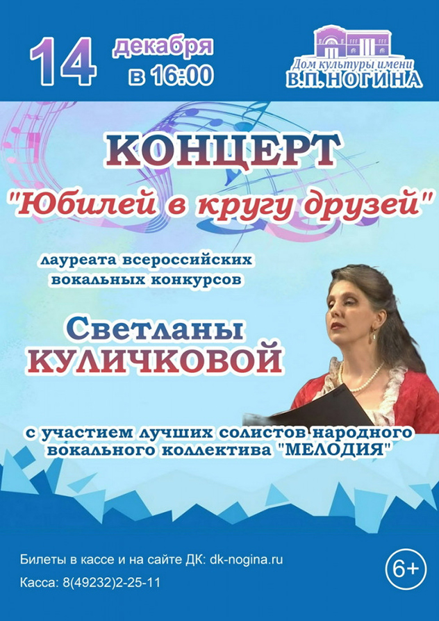 Праздничный концерт-бенефис солистки народного вокального ансамбля «Мелодия» Светланы Куличковой. В старинном зале Дома культуры классическая музыка встретится с популярной песней, романс с современной эстрадой.
