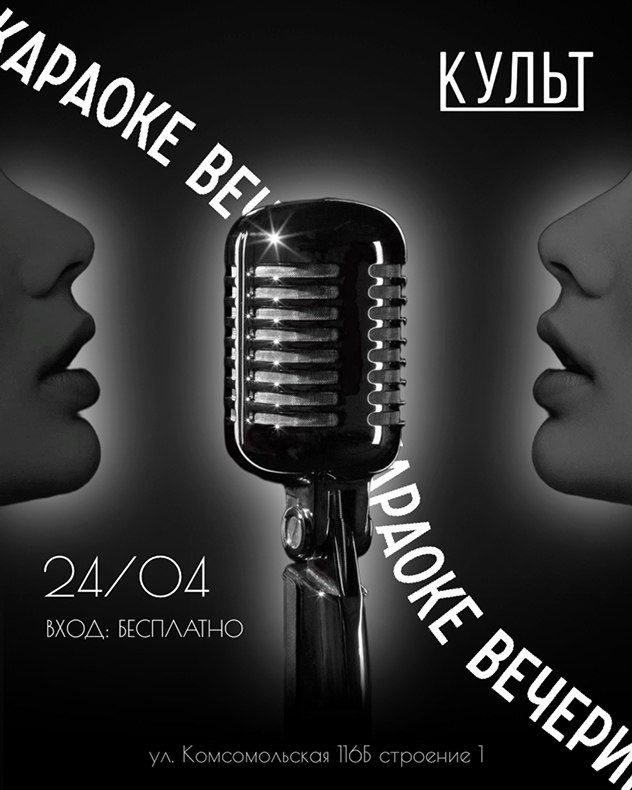 КАРАОКЕ-ВЕЧЕР в КУЛЬТПрекрасный ведущий Евгений Кочергин — музыкант, вокалист, педагог, участник шоу «Ярче Звёзд» на ТНТ, победитель шоу «Поймай меня, если сможешь»Приглашаем испробовать обновленную систему караоке уже в эту пятницу.