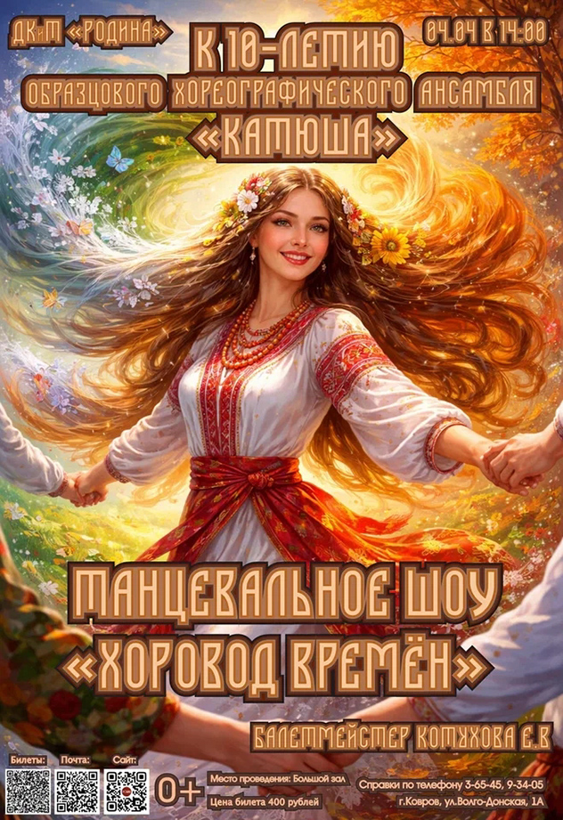 Концерт «Хоровод времен», посвященный 10-летнему юбилею Образцового хореографического ансамбля «Катюша». Это будет настоящий праздник танца, который оставит в сердцах гостей теплые воспоминания!