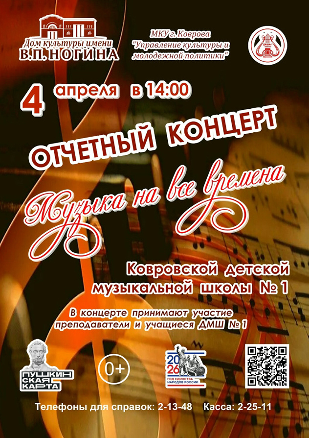 Праздничный концерт Ковровской детской музыкальной школы № 1 «Музыка на все времена».Концертная программа начнется в фойе выступлением учащихся преподавателей Жуковой Е.А. и Маюковой А.В. на синтезаторе.