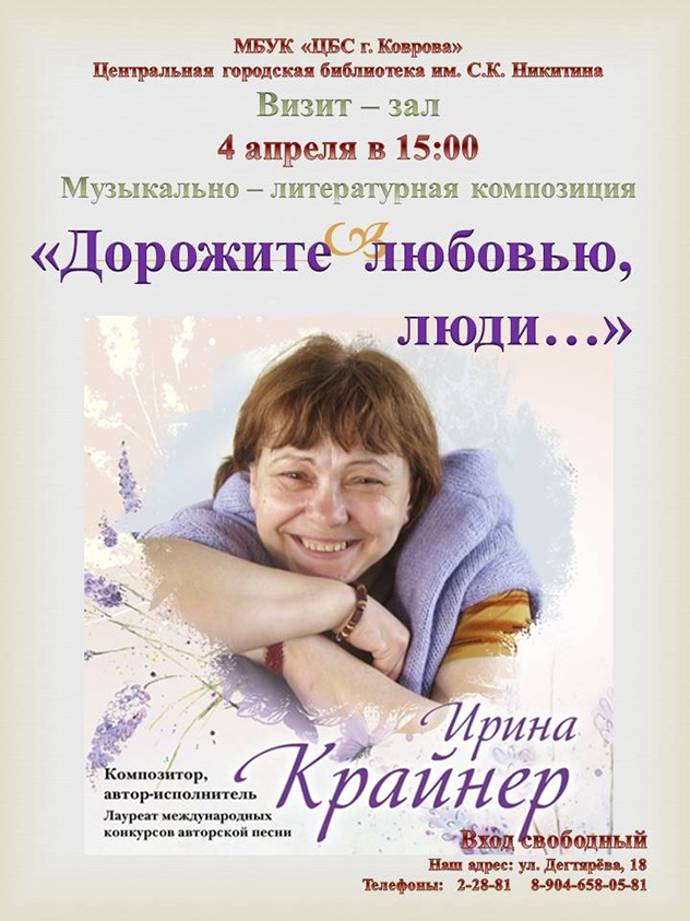 Музыкально-литературная гостинная «Дорожите любовью, люди…». Композитор, автор-исполнитель, лауреат международных конкурсов авторской песни Ирина Крайнер.