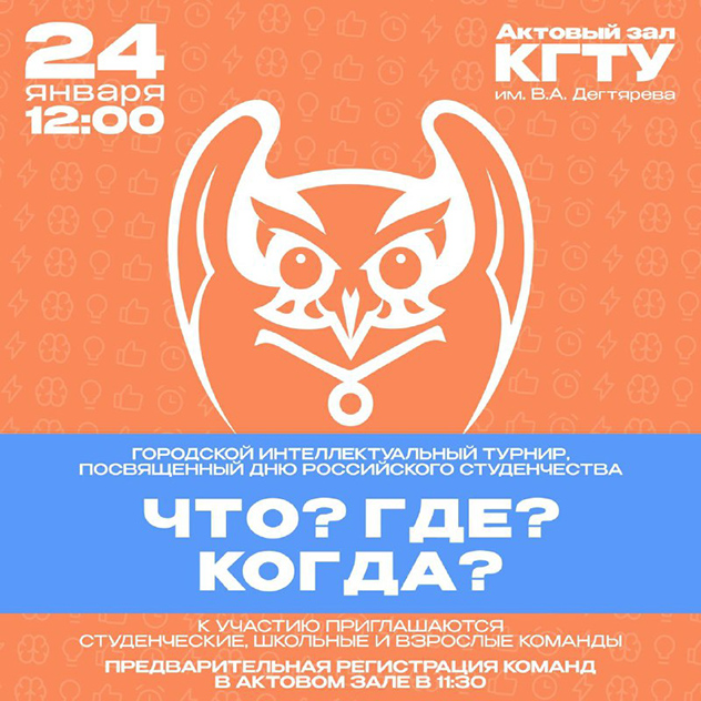 Традиционный турнир ЧГК в школьном, студенческом и взрослом зачете. Предварительная регистрация команд в актовом зале с 11:30, старт игры в 12:00.