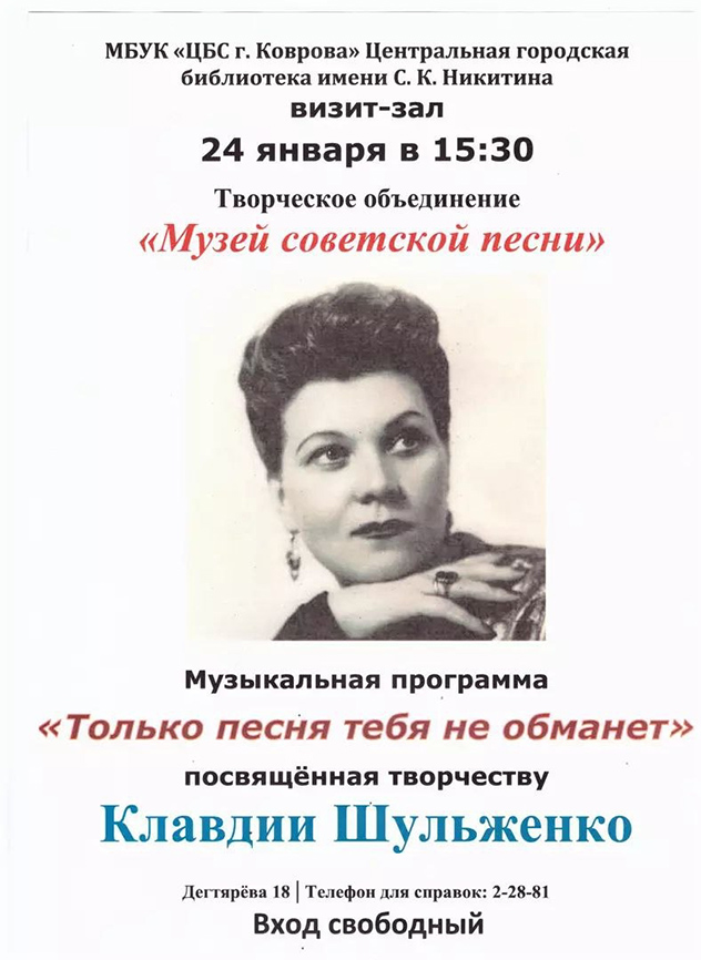 Музыкальная программа «Только песня тебя не обманет», посвященная творчеству Клавдии Шульженко. Творческой объединение «Музей советской песни».