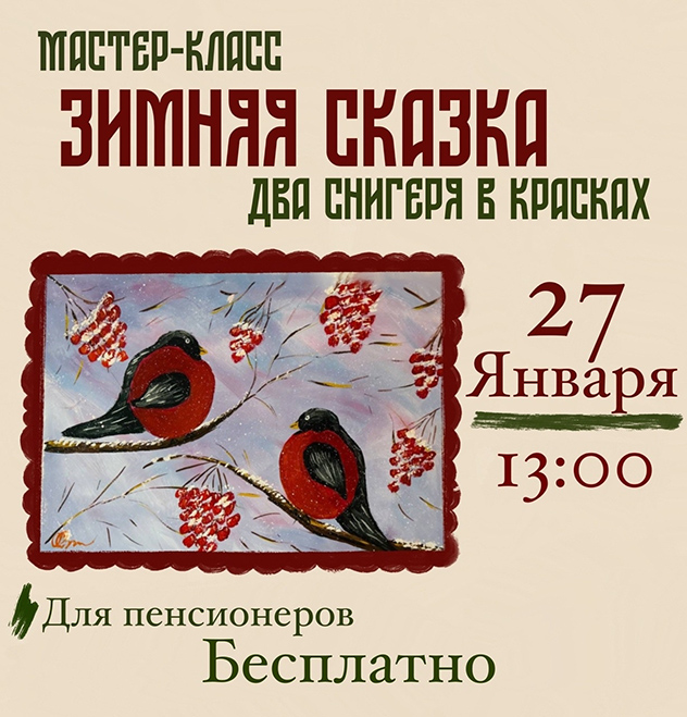 Рисуем двух снегирей в красках. Каждый вторник бесплатные мастер-классы для пенсионеров.