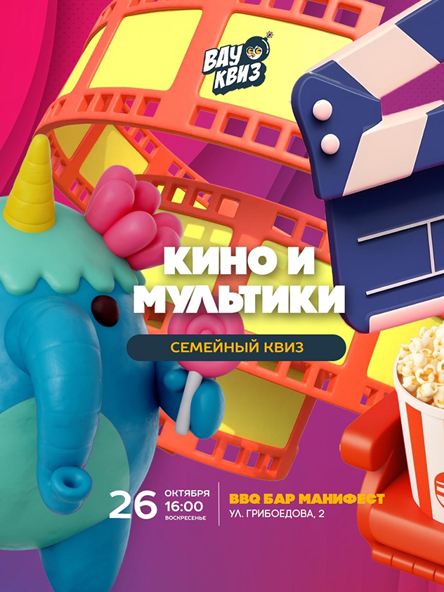 Семейный квиз. Кино и мультики. Готовы к большому кинопоказу для всей семьи? Без рекламы и трат на попкорн. В этот четверг собираем самый уютный и дружный зал на квизе, где главные роли достанутся вашей команде!