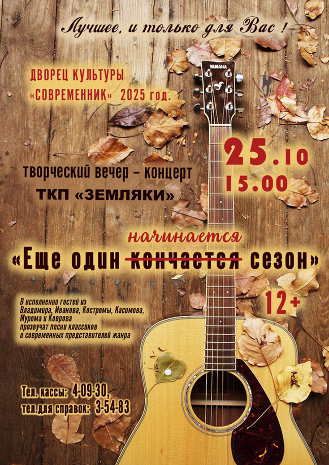 Творческий вечер-концерт ТКП «Земляки» — лучшее и только для Вас. В исполнении гостей из Владимира, Иванова, Костром и др. прозвучат песни классиков и современных представителей жанра.