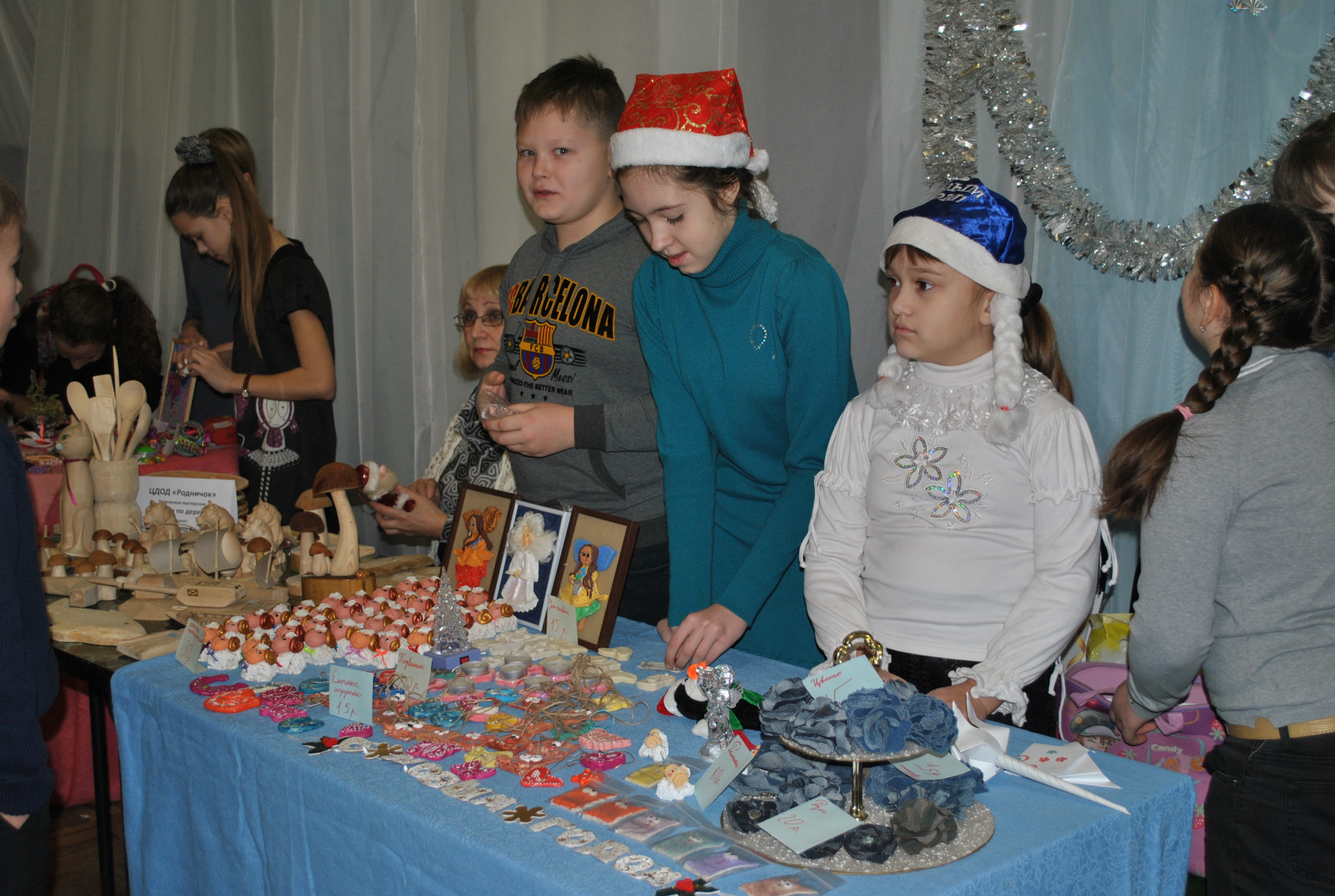 По традиции в фойе дома культуры развернулась выставка-продажа новогодней атрибутики. В ней участвовали ЦДОД «Родничок», Дом Детского Творчества, ДКиТ «Родина», ДЮЦ «Гелиос», школа-интернат № 1 и школа № 10. Чего только не было на выставки: символы нового года — глиняные овечки и козы, елки из ниток, бумаги, кофейных зерен и даже макарон, а сколько елочных игрушек и украшений для интерьера!