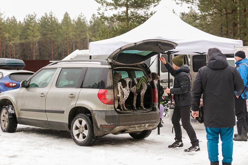 Было довольно много курцхааров, что удивительно — собаки-то гладкошерстные, то есть, холод не любят. Хозяева побеспокоились, одели своих четвероногих напарников в спортивные костюмчики.