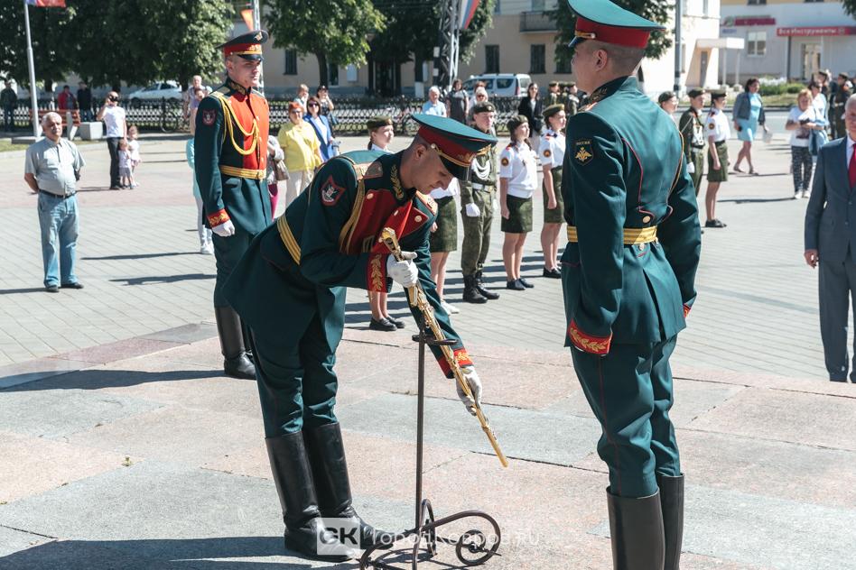 В качестве финала церемонии, было сказано, что праздник в городе только начинается — День России. И поскольку город у нас — воинской славы, к мемориалу Вечный огонь в память о Великой Победе возложили цветы и венки, а военные салютовали оружейными залпами.