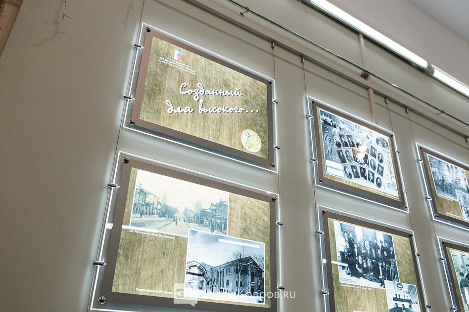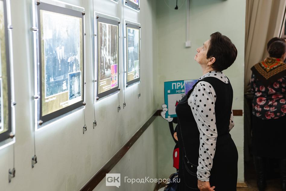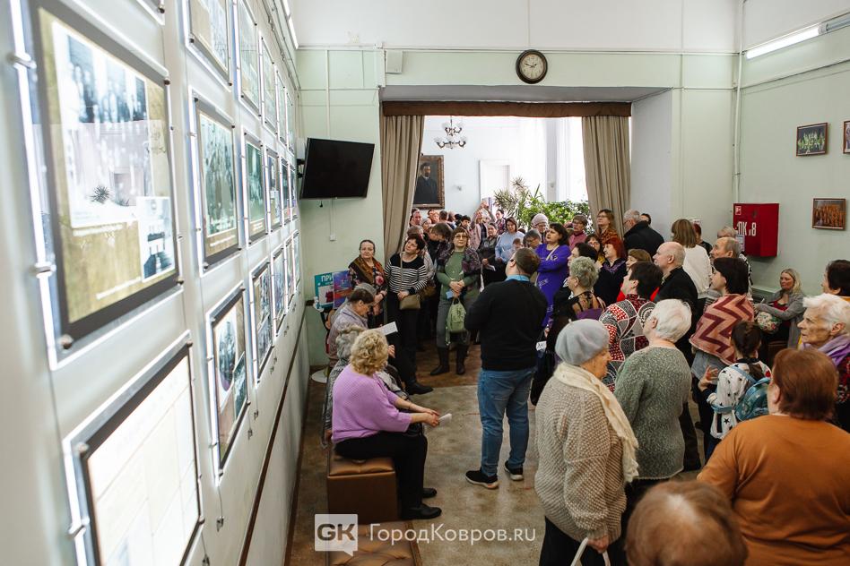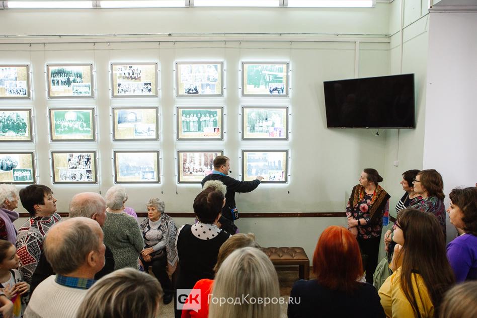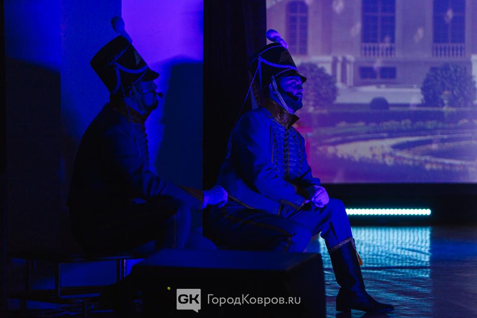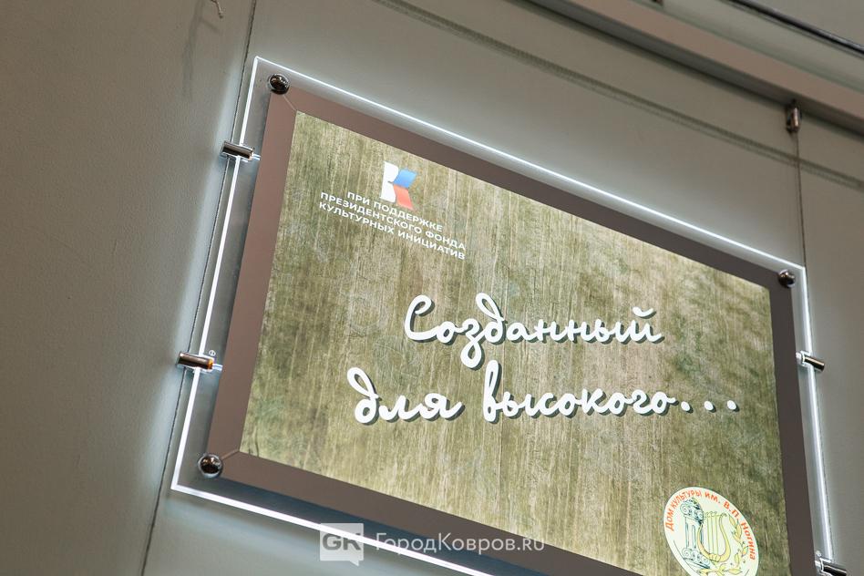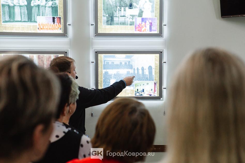Ещё один момент. Чтобы оценить всю полноту эмоционального воздействия на зрителя, надо мысленно вернуться в самое начало мероприятия. Прежде, чем зрители вошли в зал, в фойе ДК для них ковровский режиссёр Сергей Лапин (гид выставки-проекта) провёл мини-экскурсию. Он рассказал об истории Дома культуры на примере эффектно оформленных и подсвеченных фотографий, на которых исторические снимки — интерьеры и внешний облик ДК имени Ногина с момента постройки здания до наших дней.