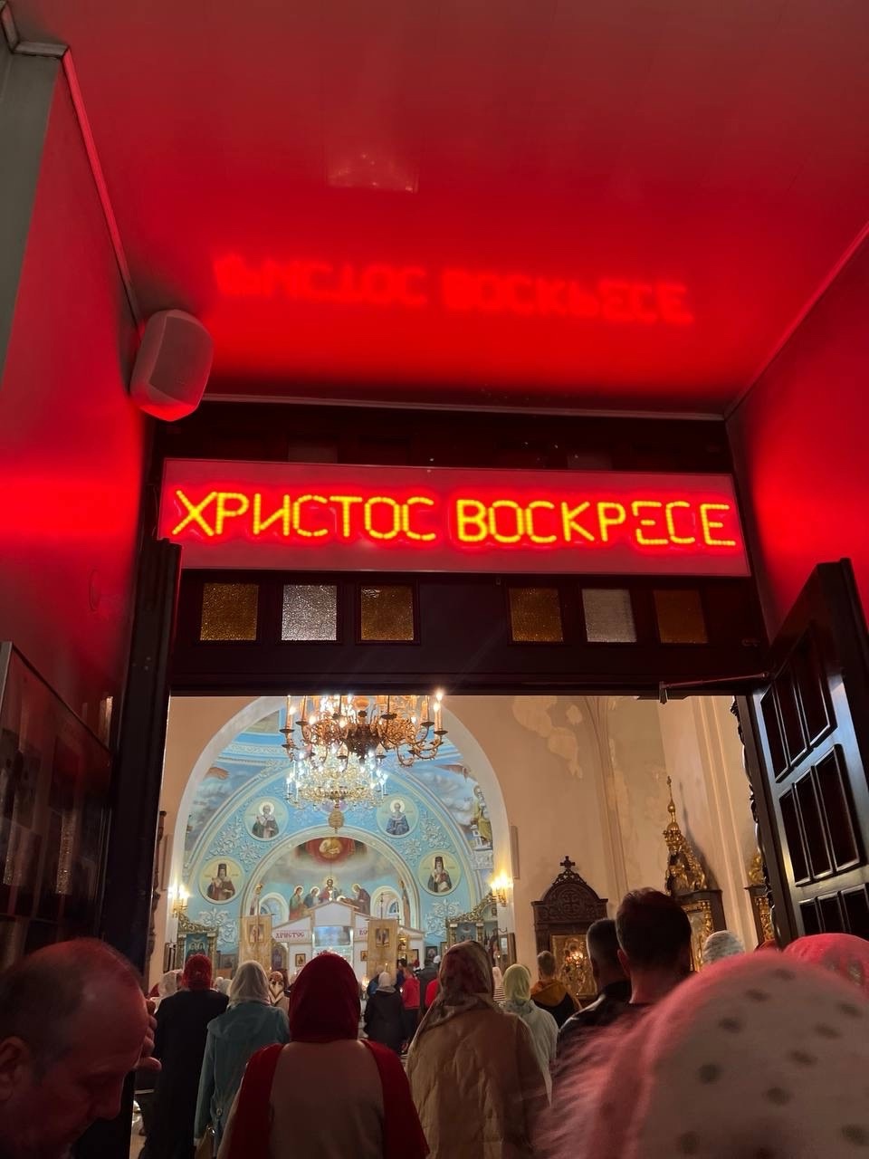 Далее все участники процессии с иконами обходят храм, продолжая петь. У входа трижды поют пасхальный тропарь «Христос воскресе».