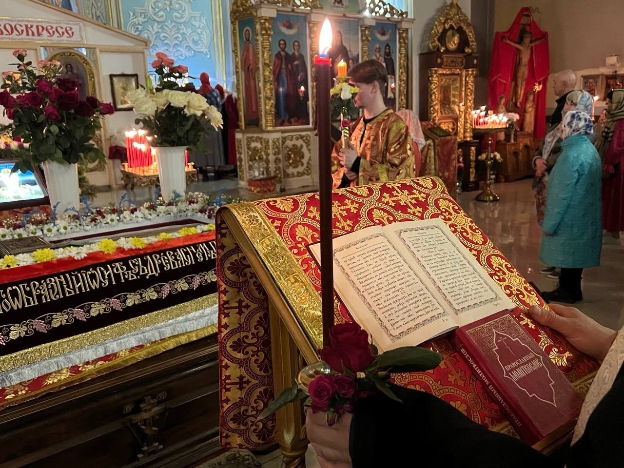 Во время утрени священник кадит, меняя облачения на разные цвета и приветствует прихожан словами «Христос воскресе».