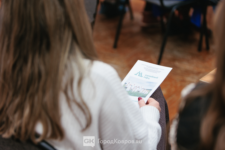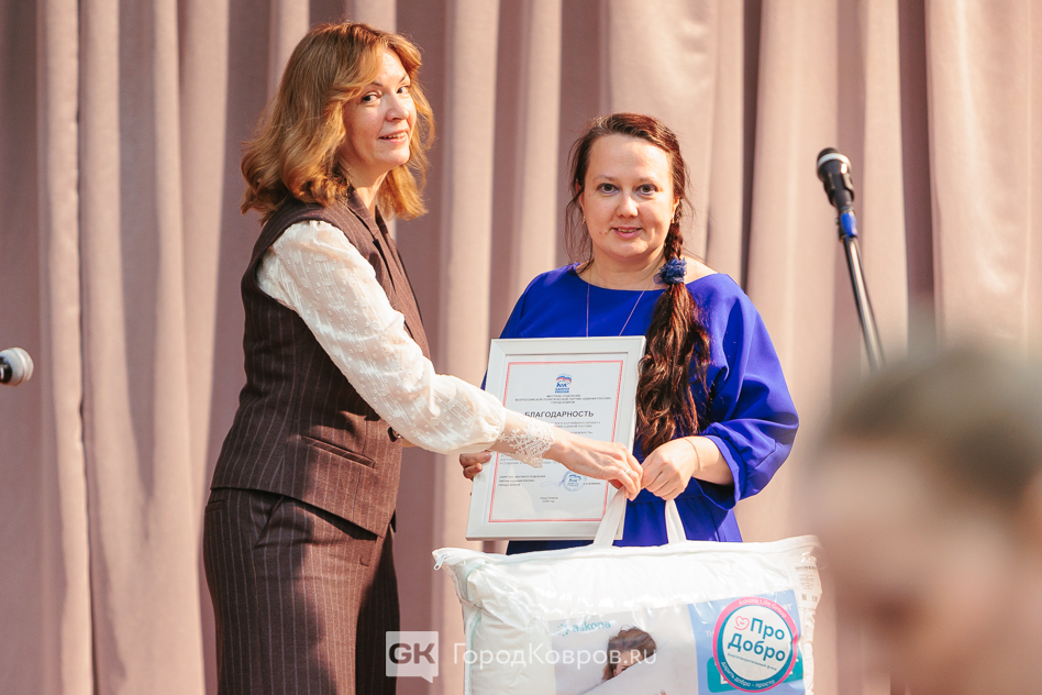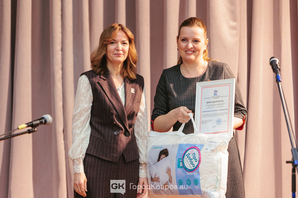 Евгения Гурьянова стала главной героиней вечера. Когда её вызвали для награждения, зал взорвался аплодисментами. У неё десять детей: семеро несовершеннолетних и трое взрослых. Сама она в Коврове всего пять лет, и о том, что в городе живёт такая удивительная семья, социальные службы узнали лишь недавно, когда Евгения оформляла пособие на младшую дочь.