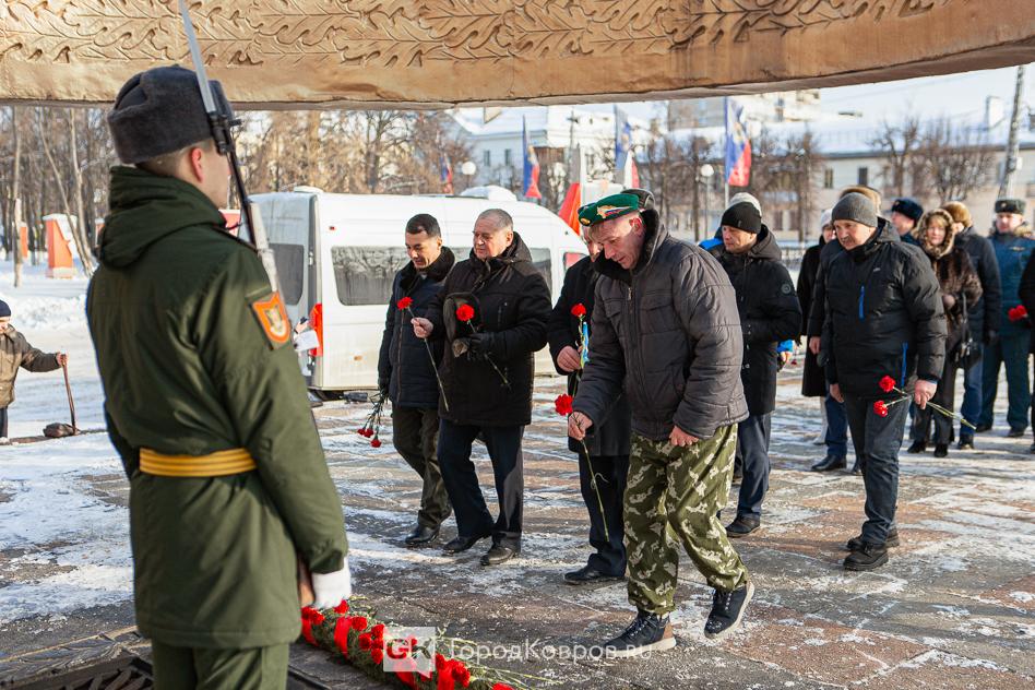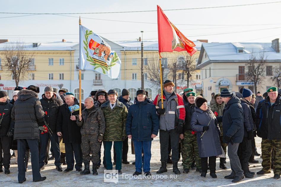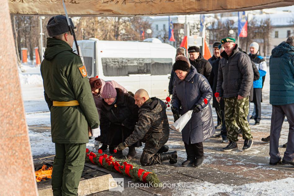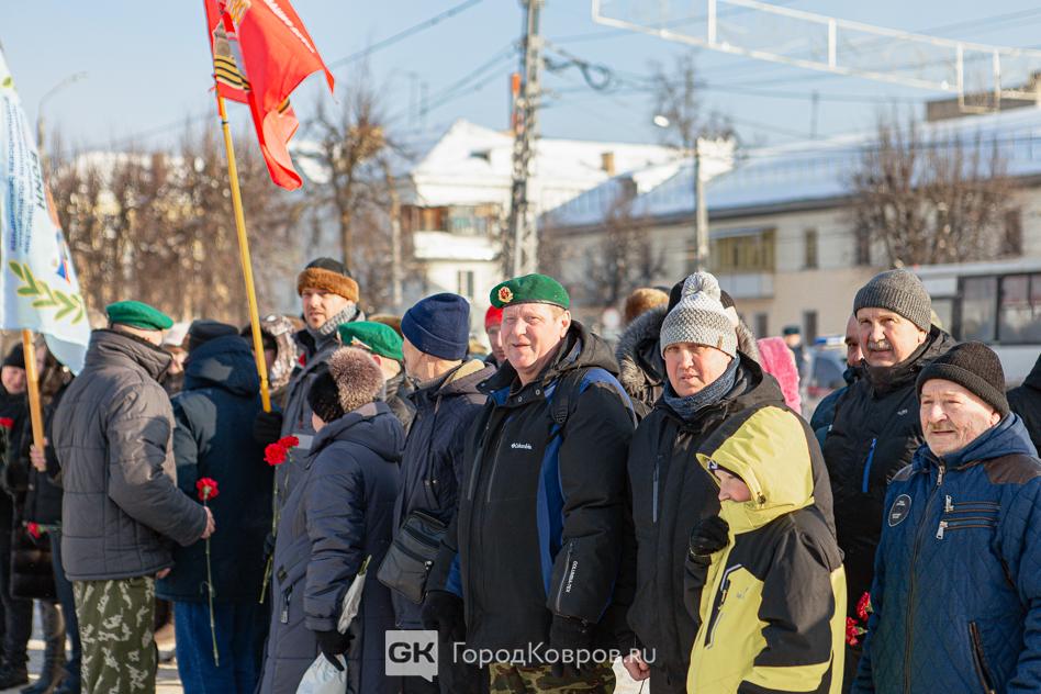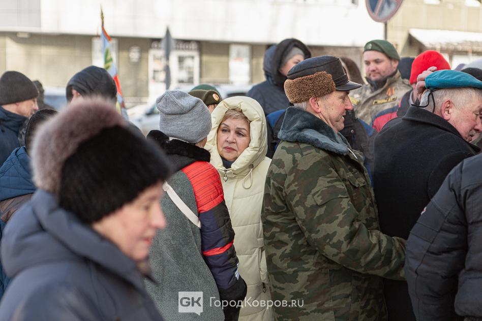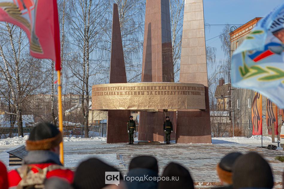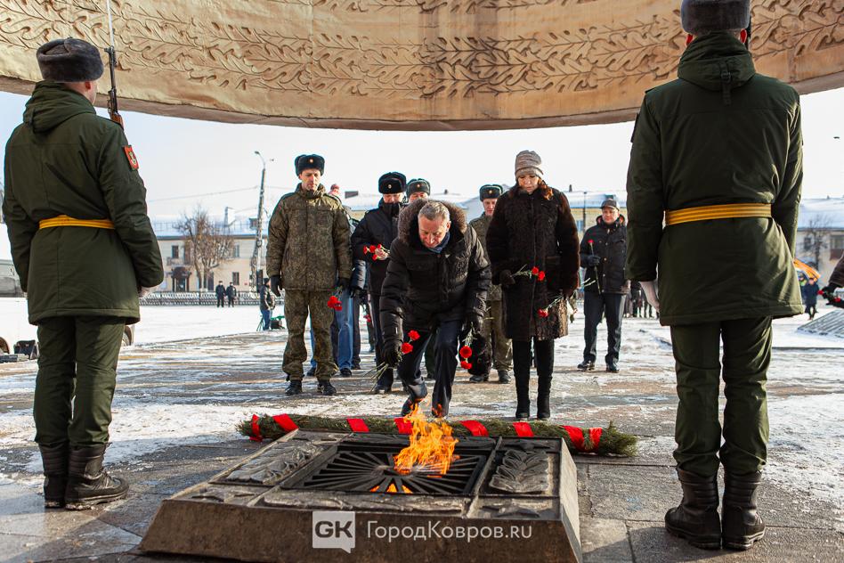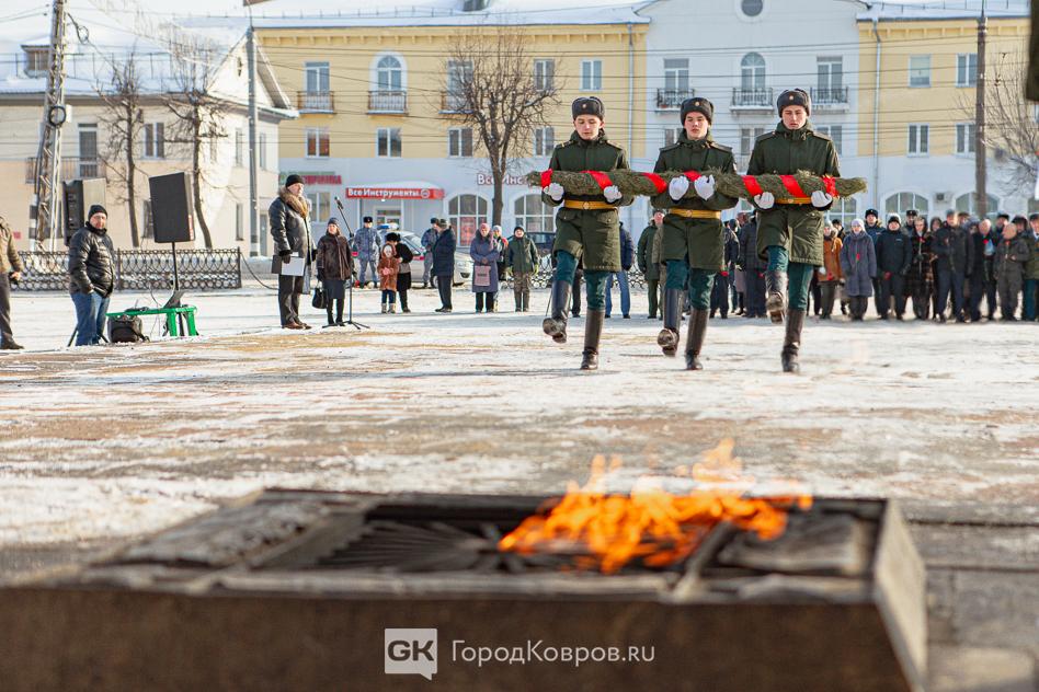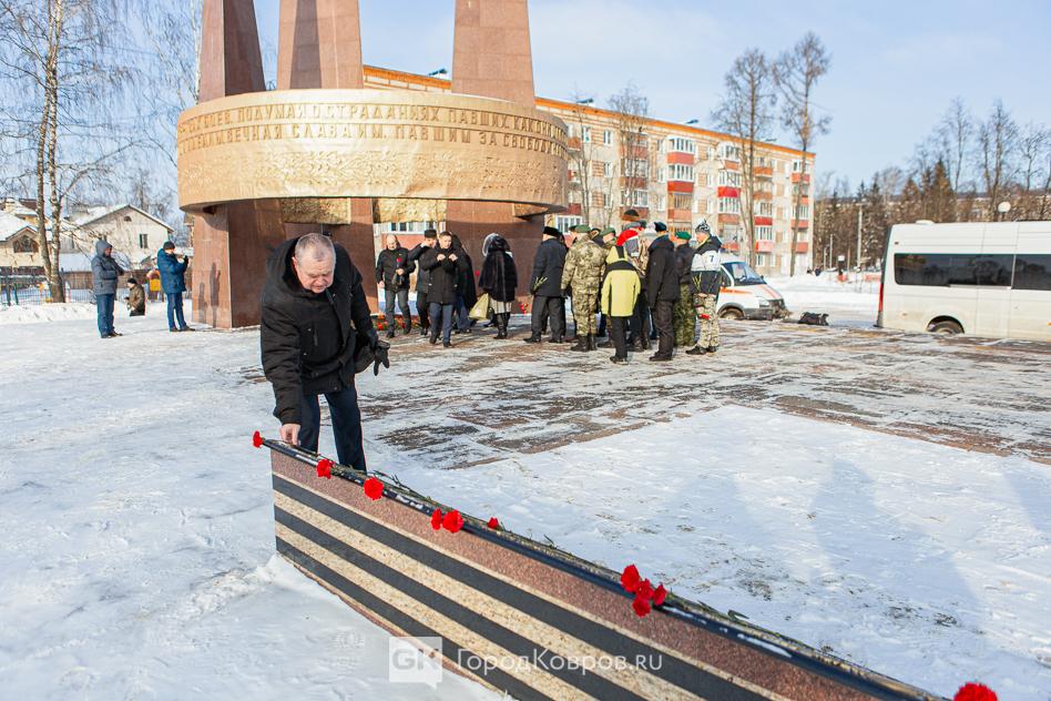 За лаконичными речами последовало, возложение траурной гирлянды из еловых веток и цветов к мемориалу. Был салют. Не праздничный фейерверк, но холостые ружейные залпы, произведённые бойцами Ковровской дивизии. Коврову — городу Воинской славы — салютовать в День защитника Отечества положено по статусу.
