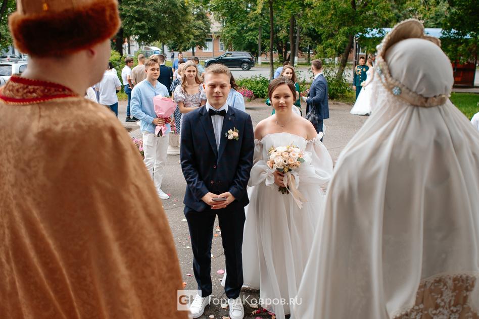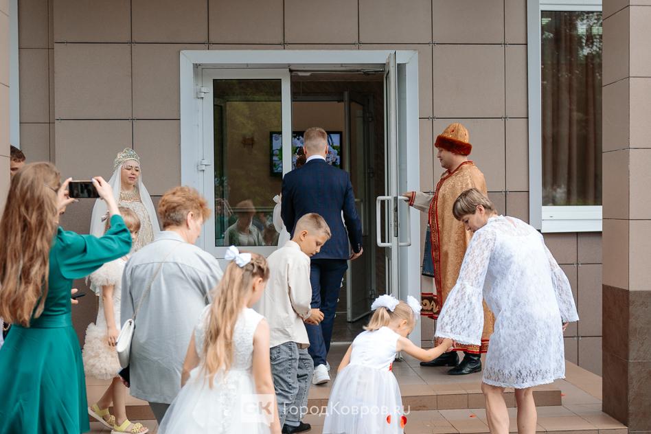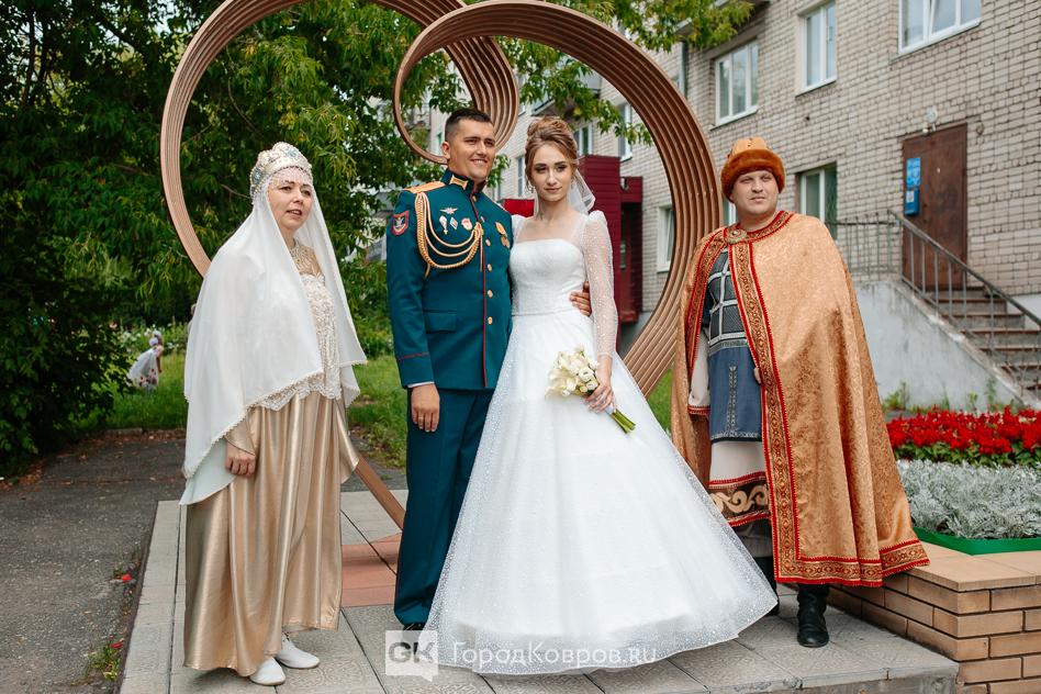 По традиции в канун праздника в Коврове принято не только награждать пары прожившие вместе долгие годы, но и проводить особые церемонии регистрации брака. Именно, поэтому у входа в ЗАГС молодоженов встречали символы грядущего праздника — Петр и Феврония.